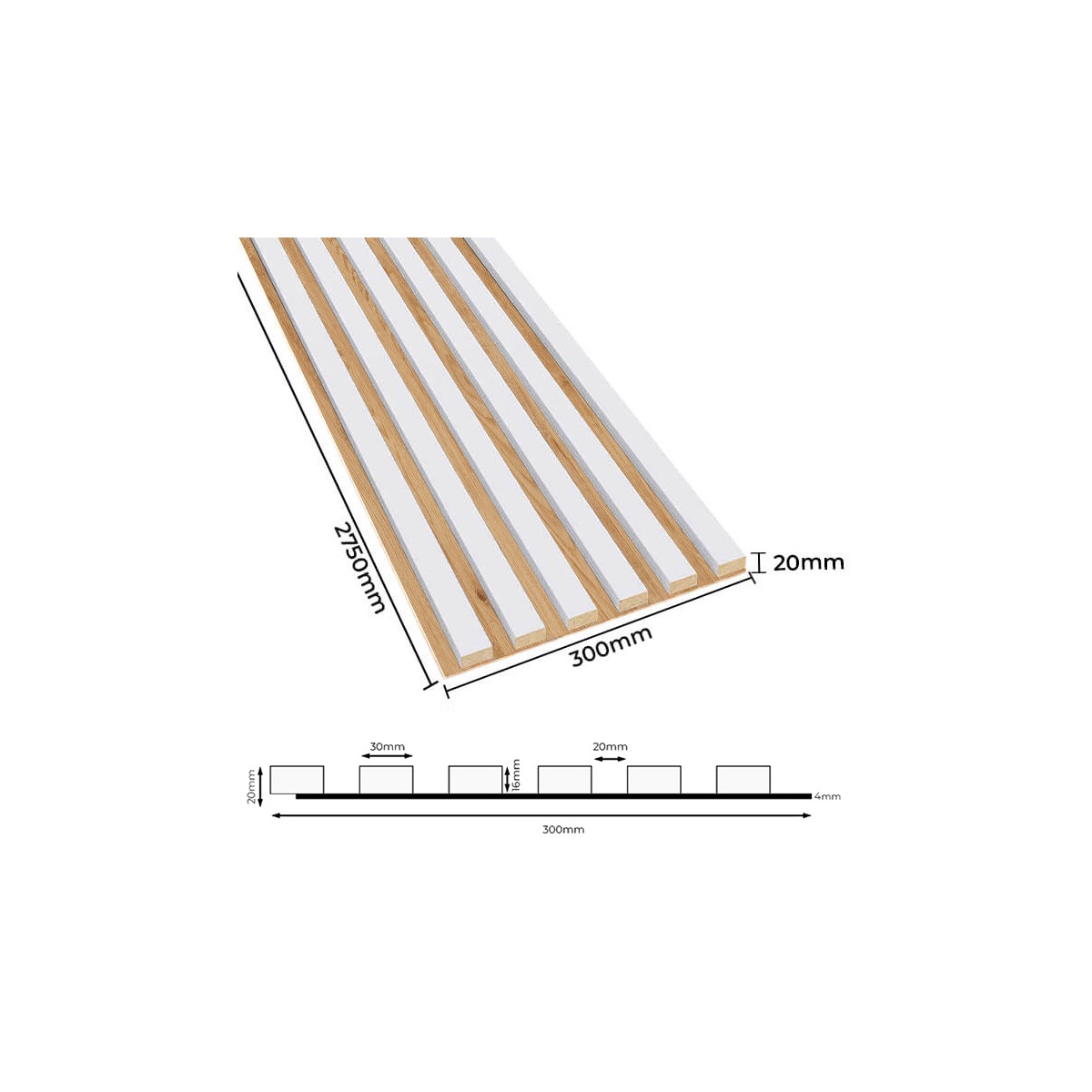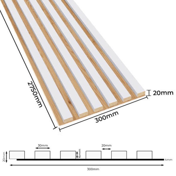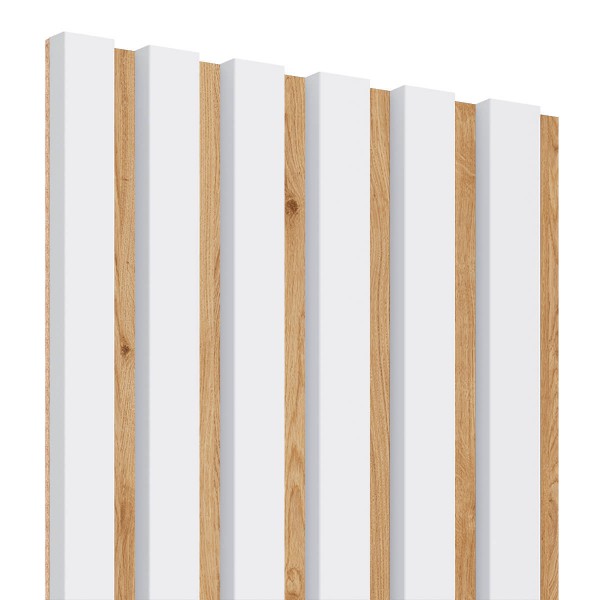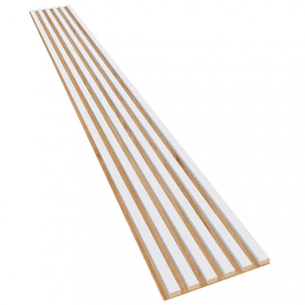 Akustik-Wandpaneele sind eine modische und praktische Art, Ihr Interieur zu dekorieren! Dank der 3 mm dicken HDF-Platte und der vertikalen Lamellen absorbieren die Paneele hervorragend die Schallwellen und eliminieren den Nachhall im Raum. Zusätzlich zu ihrer akustischen Funktion sind die Paneele auch eine modische und moderne Dekoration für Wände und Decken in jedem Interieur. Die Wandpaneele sind in 15 verschiedenen Dekoren erhältlich, die auf einer schwarzen Platte aus haltbarer und leichter HDF-Platte montiert sind. Sehen Sie sich die verfügbare Variante mit weißen Lamellen auf einer Eichenplatte an!