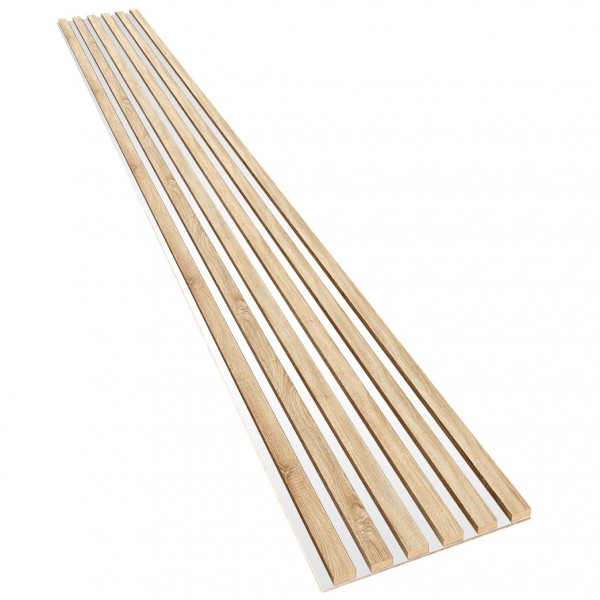 Holzlamellen auf HDF Eiche Sonoma sind eine zeitlose Lösung, die sich für jeden Einrichtungsstil eignet. Lamellen für die Wand oder Decke auf dicker HDF-Platte können in jedem Raum als Hauptdekoration oder als Ergänzung zu anderen Elementen installiert werden. Die schwarze HDF-Platte harmoniert nicht nur gut mit dem hellen Farbton der Sonoma-Eiche, sondern hat vor allem akustische Eigenschaften. Eine solche Platte eignet sich daher besonders gut für das Schlafzimmer, das Wohnzimmer, das Büro, aber auch für den Korridor. Sonoma-Eiche ist eine so universelle Farbe, dass sie sowohl mit dunklen als auch mit hellen Farben kombiniert werden kann, und die Lamellen ähneln aufgrund ihrer Struktur und Maserung massivem Holz.
