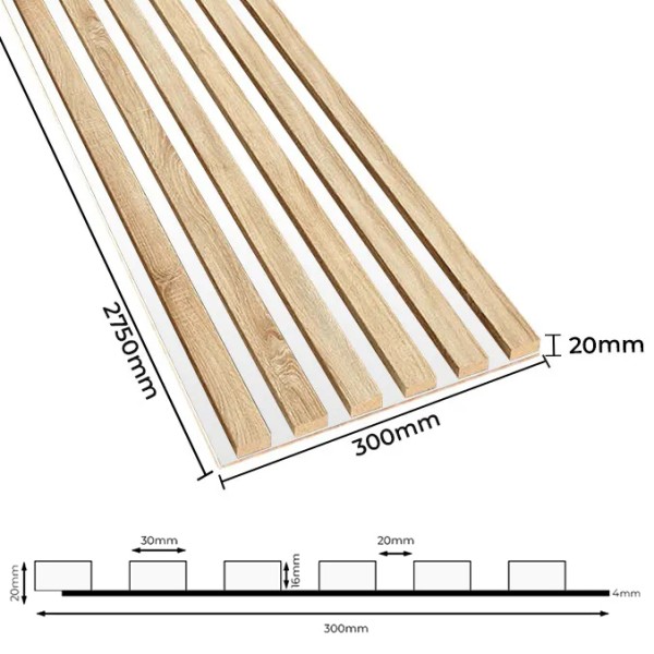 Acoustic wall panels are a fashionable and practical way to decorate your interior! Thanks to 3mm HDF board and vertical slats, the panels perfectly absorb sound waves, eliminating reverberation in the room. In addition to their acoustic function, wooden panels also serve as a fashionable and modern decoration for walls and ceilings in any interior. The acoustic slat panels come in several different decors mounted on a black HDF panel made of durable, lightweight board. Check out the available variations!