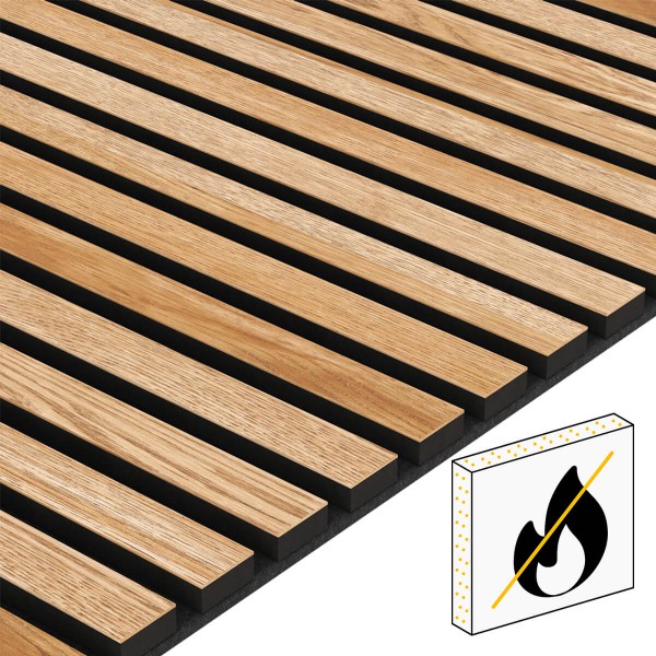 Ognioodporne panele fornirowane Lameo posiadają także właściwości akustyczne! Dzięki filcowej powierzchni, oraz przestrzeniom między lamelami, produkt znacznie wpływa na akustykę przestrzeni obiektu, tłumiąc echo i pogłos.